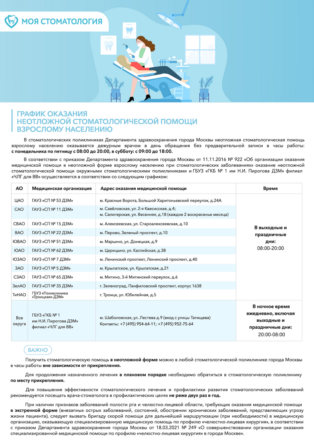 Медицинская помощь по профилю «стоматология» взрослым, в том числе в экстренной и неотложной формах, в рамках Территориальной программы обязательного медицинского страхования в рабочие дни оказывается в городских стоматологических поликлиниках по месту жительства или прикрепления с 08:00 до 20:00 часов, в субботу с 09:00 до 18:00. Перечень стоматологических поликлиник доступен на официальном сайте Департамента здравоохранения города Москвы (https://www.mos.ru/clinics/stomatologicheskie-polikliniki/ ).